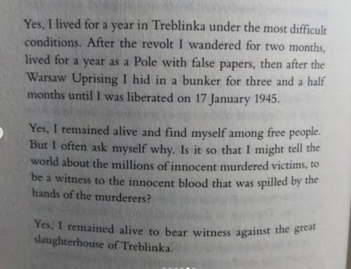 It’s these Treblinka survivors I want to consider first. The existence of the camp it is the sort of thing I would prefer to ignore. There is enough despair in the world at any given moment that such trips back to history’s darkest places seem redundant if not cruel. But Treblinka also commands our attention as an astounding example of the human will to live. That will is embodied in Treblinka’s 67 survivors.
